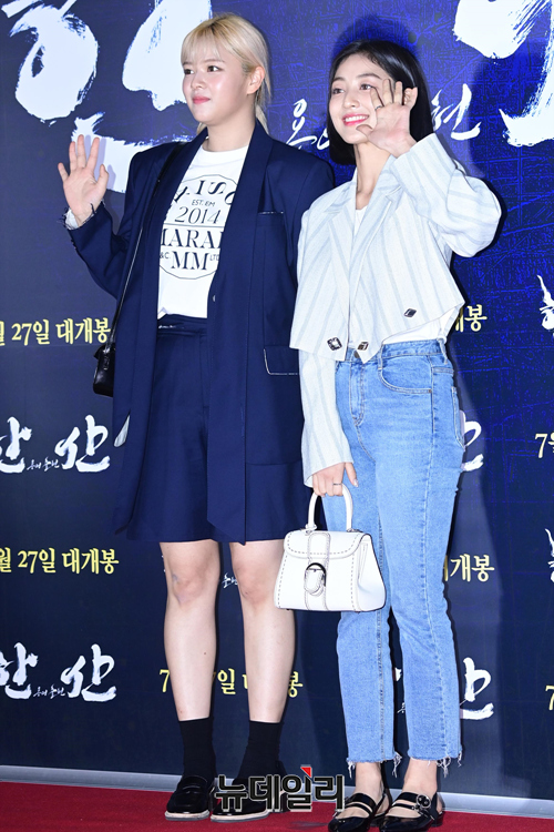 가수 정연, 지효가 26일 오후 서울 송파구 롯데시네마 월드타워점에서 열린 영화 '한산:용의 출현(감독 김한민)' VIP시사회에서 포즈를 취하고 있다.