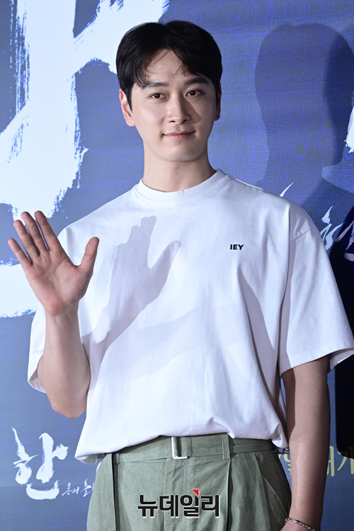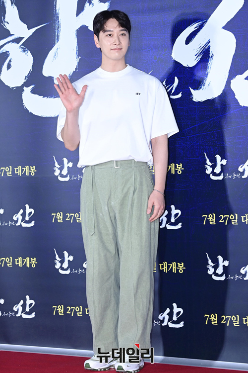 배우 황찬성이 26일 오후 서울 송파구 롯데시네마 월드타워점에서 열린 영화 '한산:용의 출현(감독 김한민)' VIP시사회에서 포즈를 취하고 있다.