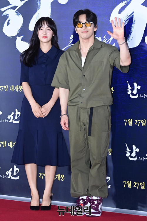배우 김재인 동현배가 26일 오후 서울 송파구 롯데시네마 월드타워점에서 열린 영화 '한산:용의 출현(감독 김한민)' VIP시사회에서 포즈를 취하고 있다.