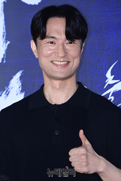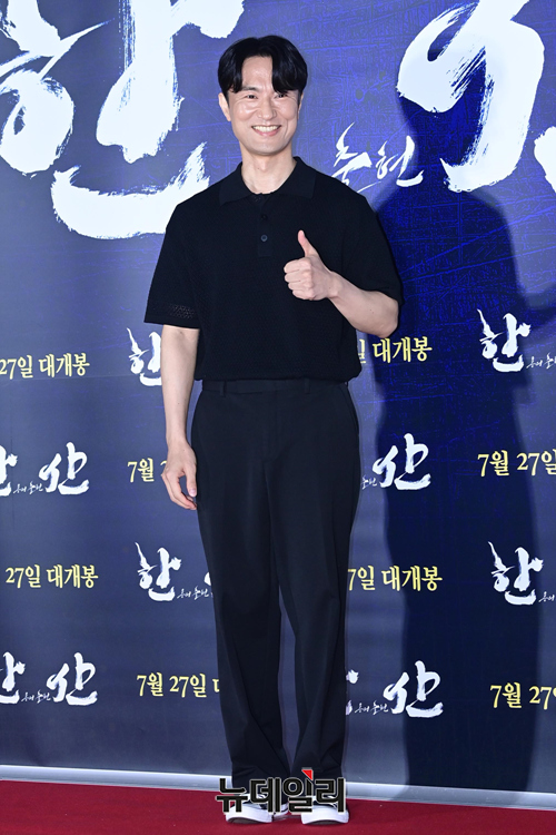 배우 김병철이 26일 오후 서울 송파구 롯데시네마 월드타워점에서 열린 영화 '한산:용의 출현(감독 김한민)' VIP시사회에서 포즈를 취하고 있다.