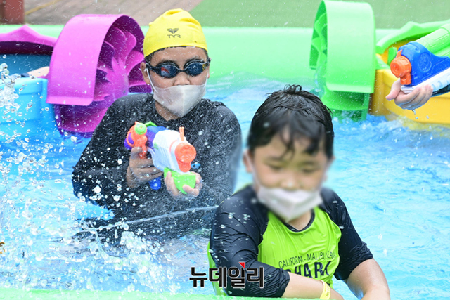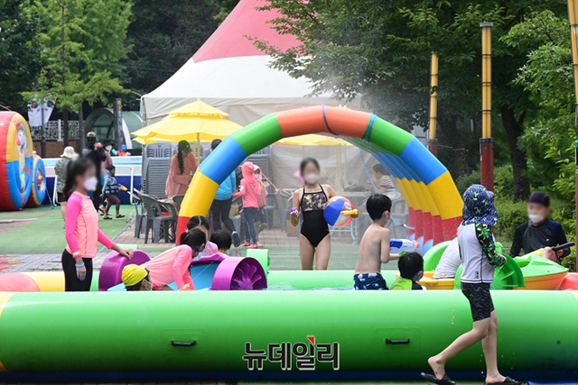 장기화된 코로나19로 중단됐던 동작주차공원 물놀이장이 재개장한 27일 오후 어린이가 물놀이를 하고 있다.