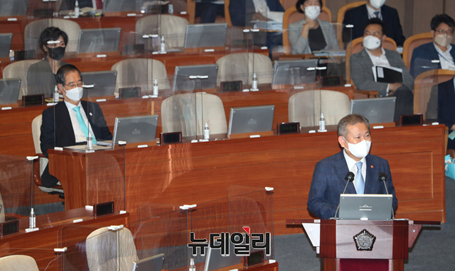 이상민 행정안전부 장관이 27일 오후 국회 본회의장에서 열린 교육·사회·문화 분야 대정부질문에서 의원들의 질문에 답하고 있다. (사진=공동취재단)