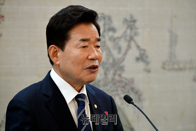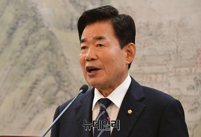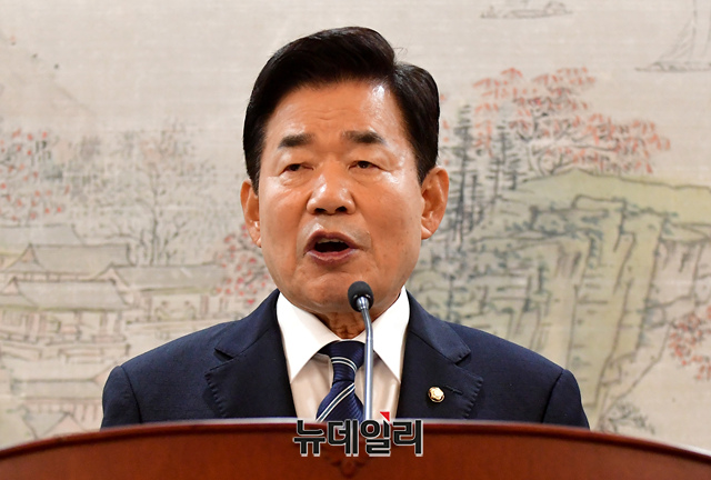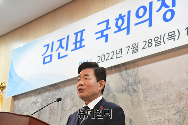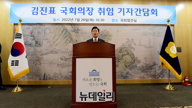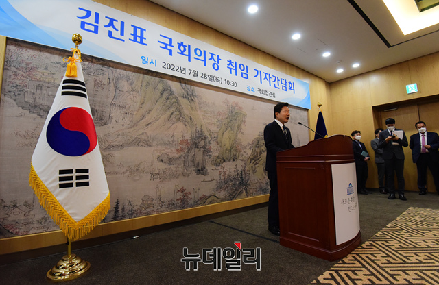김진표 국회의장이 28일 오전 국회에서 열린 취임 기자간담회에서 모두발언을 하고 있다.