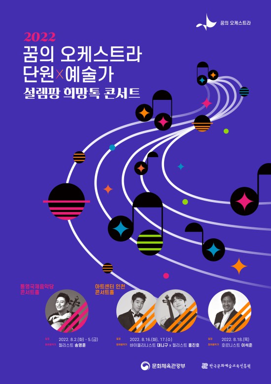 2022 꿈의 오케스트라 '설렘팡 희망톡 콘서트'가 8월 2~5일 통영국제음악당, 16~18일 아트센터 인천에서 열린다.문화체육관광부(장관 박보균)가 주최하고 한국문화예술교육진흥원(원장직무대리 박창준, 이하 교육진흥원)이 주관하는 '설렘팡 희망톡 콘서트'는 꿈의 오케스트라 12년차를 맞아 진행되는 최초의 협연 프로그램이다.단원들이 전문 음악가와의 협연 경험을 통해 예술적 상상력 증진시키고 음악 전문 역량을 강화할 수 있는 기회를 제공하고자 기획했다. 클래식 음악분야에서 활발하게 활동하고 있는 △송영훈(첼로) △대니구(바이올린)·홍진호(첼로) △이석준(호른)이 단원들과 함께 호흡을 맞춘다.아동·청소년 단원 약 1000여명이 함께하며, 꿈의 오케스트라 △고창 △부산동구 △목포 △세종 △원주 △평창 △광주남구 △창원 △공주 △통영 △군포 △강릉 △성북 △오산 등 총 14개 지역 거점기관에서 참여한다.교육진흥원 관계자는 "이번 협연 콘서트를 통해 꿈의 오케스트라 단원들의 음악적 이해와 상상력을 높일 수 있는 계기가 되고, 함께하는 음악을 통한 즐거움과 행복을 느낄 수 있는 소중한 경험이 되길 바란다"고 전했다.2011년 시작한 '꿈의 오케스트라'는 베네수엘라의 '엘 시스테마' 철학을 바탕으로 아동·청소년들이 오케스트라 합주 활동을 통해 건강한 시민으로 성장할 수 있도록 돕는 사업이다. 현재 전국 51개 거점기관에서 약 2900여 명의 단원이 활동하고 있다.