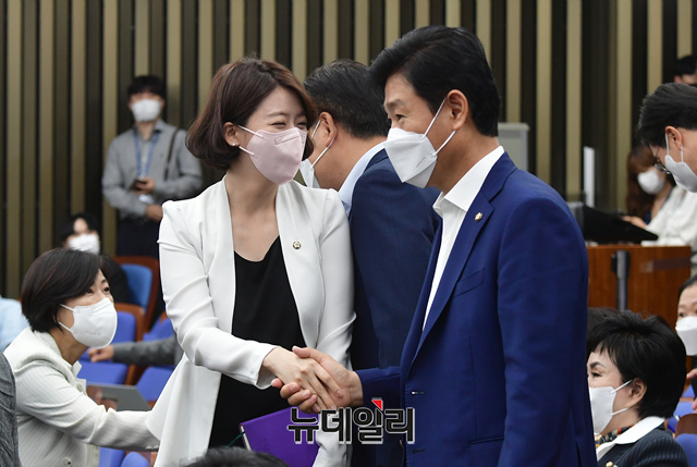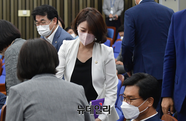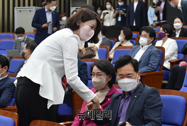 배현진 국민의힘 의원이 1일 오후 국회에서 열린 의원총회에서 의원들과 인사를 나누고 있다.