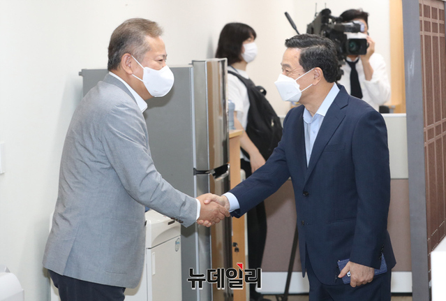 경찰국이 공식 출범한 2일 오전 이상민 행정안전부 장관이 정부서울청사에 마련된 경찰국을 방문해 김순호 초대국장과 악수하고 있다. 경찰국은 총괄지원과, 인사지원과, 자치경찰지원과 3개 과 총 16명으로 구성됐다.