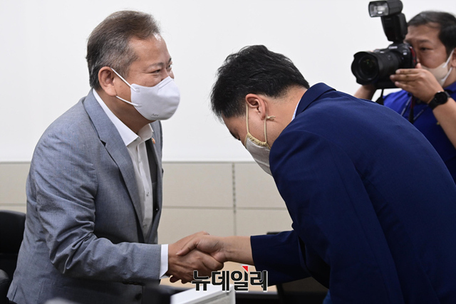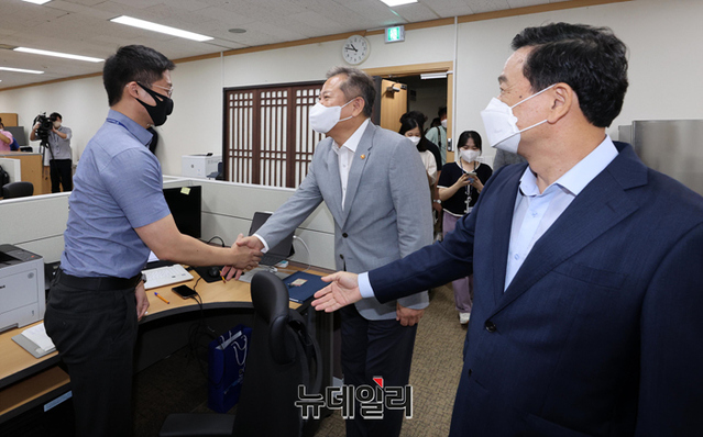 경찰국이 공식 출범한 2일 오전 이상민 행정안전부 장관이 정부서울청사에 마련된 경찰국을 방문해 직원들과 악수를 하고 있다.
