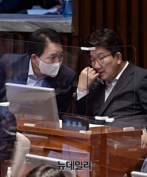 권성동 국민의힘 원내대표가 2일 오후 국회에서 열린 국회 본회의에서 성일종 정책위의장과 대화를 하고 있다. (사진=공동취재단)