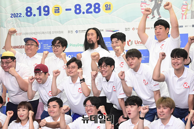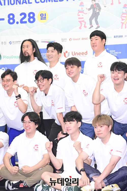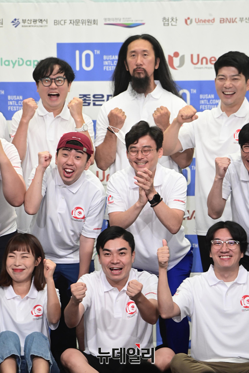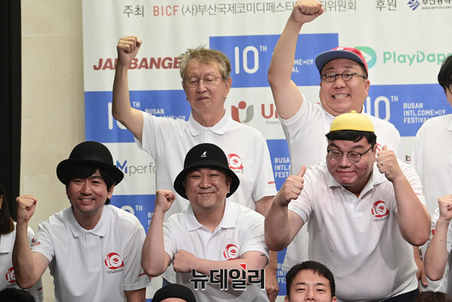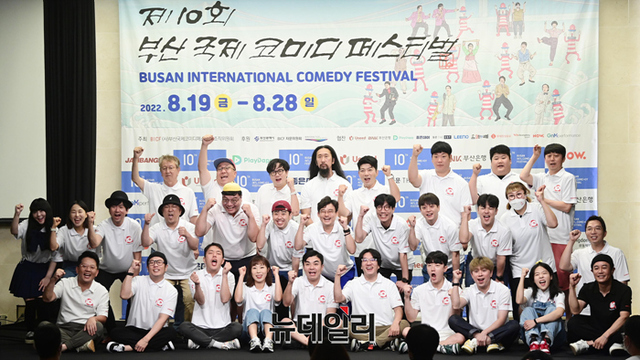 제10회 부산국제코미디페스티벌(BICF 이하 부코페) 조직위원들과 공연팀들이 3일 오전 서울 마포구 스탠포드호텔에서 열린 기자회견에서 기념촬영을 하고 있다.올해로 10주년을 맞은 '부코페'는 3년 만에 오프라인으로 열려 시민 모두가 참여 가능한 지역밀착형 축제다.이번 페스티벌은 '부산바다, 웃음바다' 주제로 전 세계에 K-코미디를 알리는 목표를 세웠다. 19일부터 28일까지 열흘간 △부산 KNN 시어터 △영화의전당 △신세계백화점 문화홀 등에서 열린다.