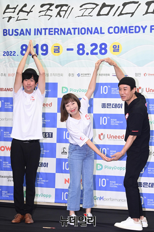 개그맨 조윤호, 개그우먼 오나미, 개그맨 김대희가 3일 오전 서울 마포구 스탠포드호텔에서 열린 제10회 부산국제코미디페스티벌(BICF) 기자회견에서 포즈를 취하고 있다.올해로 10주년을 맞은 '부코페'는 3년 만에 오프라인으로 열려 시민 모두가 참여 가능한 지역밀착형 축제다.이번 페스티벌은 '부산바다, 웃음바다' 주제로 전 세계에 K-코미디를 알리는 목표를 세웠다. 19일부터 28일까지 열흘간 △부산 KNN 시어터 △영화의전당 △신세계백화점 문화홀 등에서 열린다.