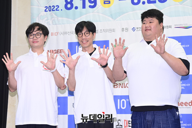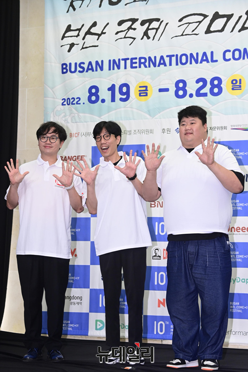 공연팀 슈퍼스타코리아(안상태, 김회경), 개그맨 김태원이 3일 오전 서울 마포구 스탠포드호텔코리아에서 열린 제10회 부산국제코미디페스티벌(BICF) 기자회견에서 포즈를 취하고 있다.올해로 10주년을 맞은 '부코페'는 3년 만에 오프라인으로 열려 시민 모두가 참여 가능한 지역밀착형 축제다.이번 페스티벌은 '부산바다, 웃음바다' 주제로 전 세계에 K-코미디를 알리는 목표를 세웠다. 19일부터 28일까지 열흘간 △부산 KNN 시어터 △영화의전당 △신세계백화점 문화홀 등에서 열린다.