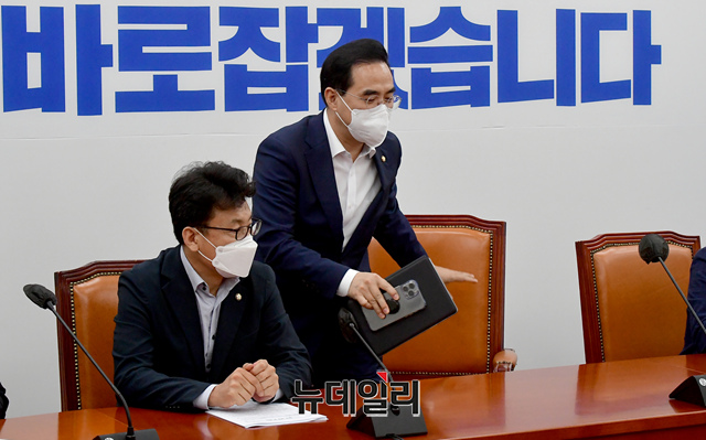 박홍근 더불어민주당 원내대표가 4일 오전 국회에서 열린 정책조정회의에 참석하기 위해 입장하고 있다.