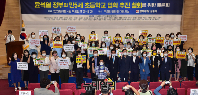 만5세초등취학저지를위한범국민연대 회원들과 참석 국회의원들이 4일 오전 서울 여의도 국회의원회관에서 열린 만5세 초등학교 입학 추진 철회 토론회에서 구호를 외치고 있다.