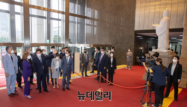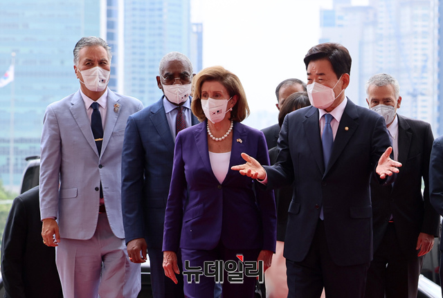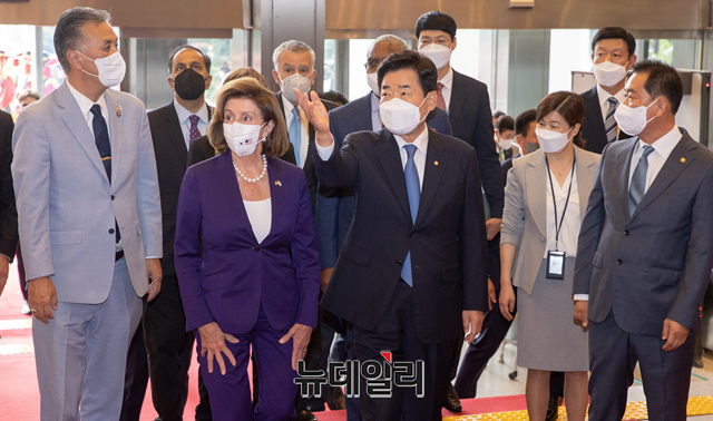 낸시 펠로시 미국 하원의장이 4일 국회를 예방한 가운데 김진표 국회의장과 대화를 나누며 들어서고 있다. (공동취재사진)