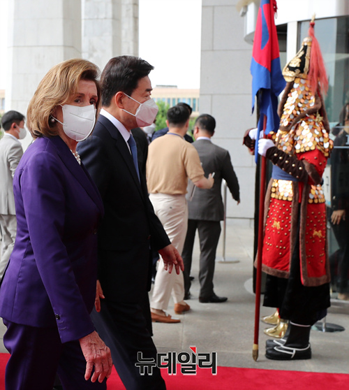 낸시 펠로시 미 하원의장이 4일 국회 본청 앞에서 김진표 국회의장과 의장대 사열을 받으며 걸어 들어 오고 있다. (공동취재사진)