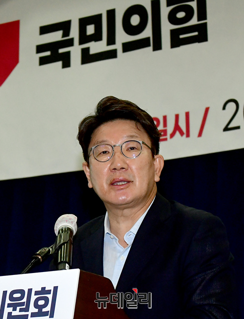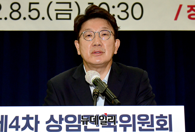 권성동 국민의힘 당대표 직무대행 겸 원내대표가 5일 국회 의원회관에서 열린 국민의힘 제4차 상임전국위원회에서 인사말을 하고 있다.