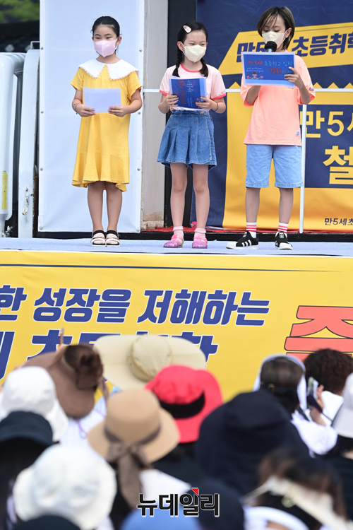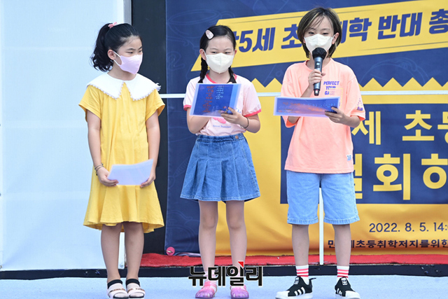 만5세 초등학교 취학 철회를 촉구하는 집회에 참석한 어린이들이 5일 오후 서울 용산구 대통령실 인근에서 열린 집회에서 발언하고 있다.