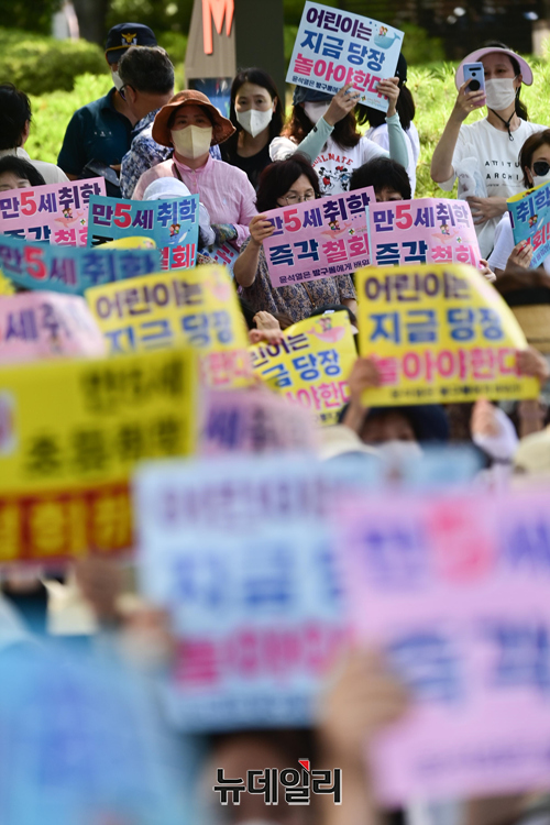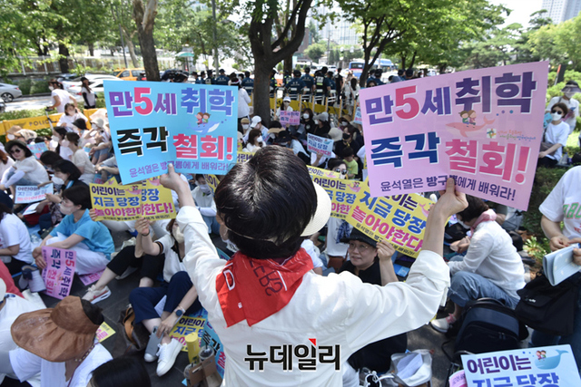 학제개편반대범국민연대가 5일 오후 서울 용산구 대통령실 인근에서 열린 '만 5세 초등학교 취학 학제 개편안' 추진 철회안을 촉구하는 집회에서 손 팻말을 들며 구호를 외치고 있다.