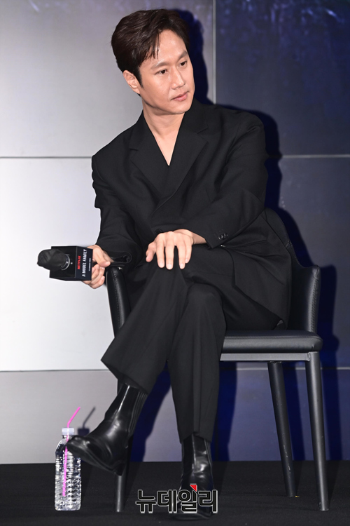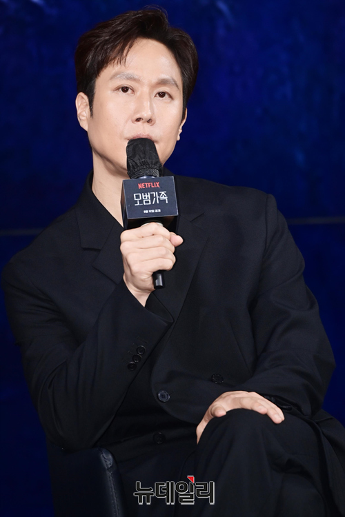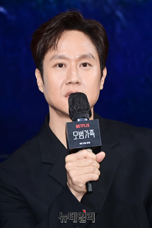 배우 정우가 9일 오전 서울 종로구 JW 메리어트 동대문에서 열린 넷플릭스 시리즈 '모범가족(감독 김진우)' 제작발표회에서 인사말을 하고 있다.