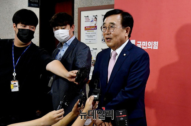 서병수 국민의힘 전국위원회 의장이 9일 국회에서 열린 비상대책위 체제 전환과 이에 따른 당헌당규 논의를 위한 열린 전국위원회에 앞서 기자들의 질문에 답하고 있다.