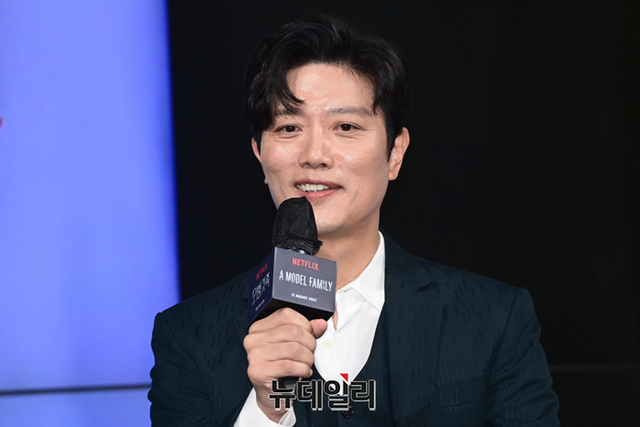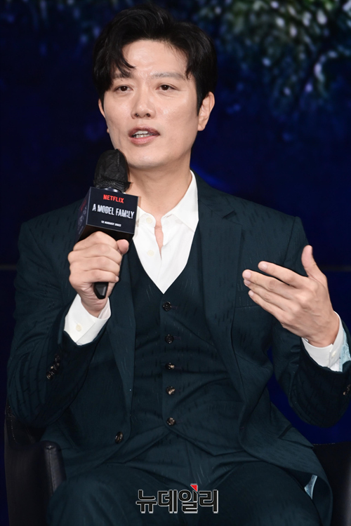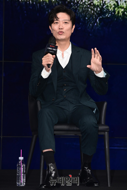 배우 박희순이 9일 오전 서울 종로구 JW 메리어트 동대문에서 열린 넷플릭스 시리즈 '모범가족(감독 김진우)' 제작발표회에서 취재진의 질문에 답하고 있다.