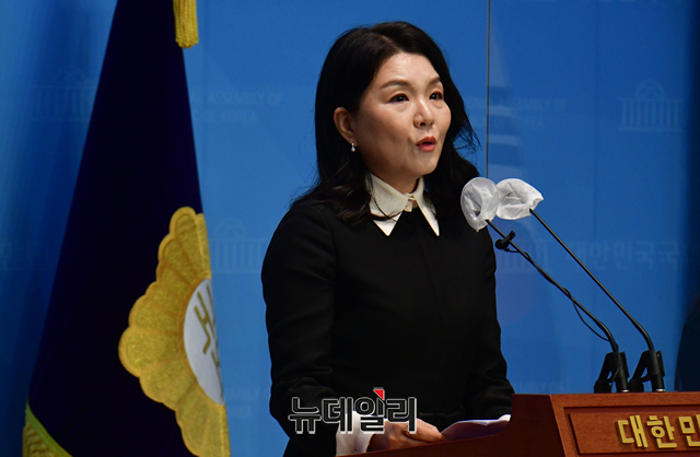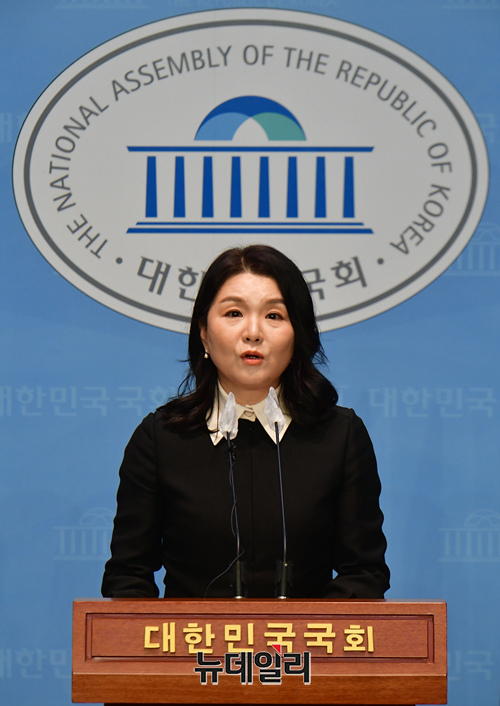 류여해 전 자유한국당 (국민의힘 전신) 최고위원이 9일 오전 국회 소통관에서 복당 기자회견을 갖고 있다.