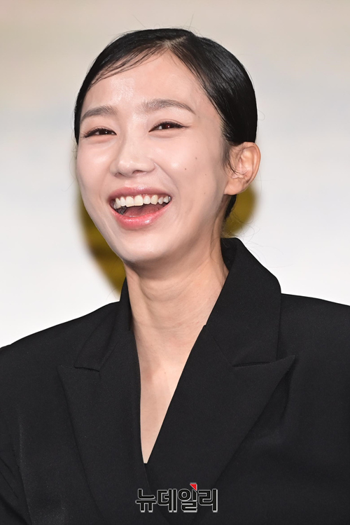 배우 박지연이 9일 오전 서울 종로구 JW 메리어트 동대문에서 열린 넷플릭스 시리즈 '모범가족(감독 김진우)' 제작발표회에서 취재진의 질문을 듣고 미소를 짓고 있다.