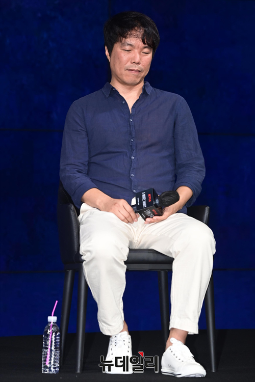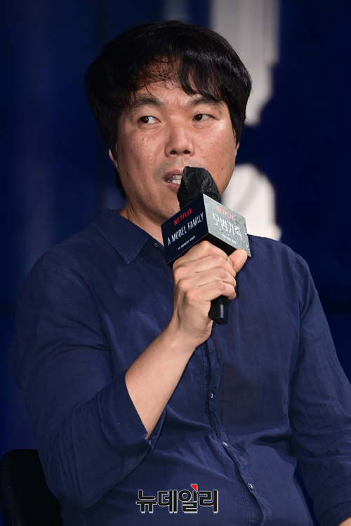 김진우 감독이 9일 오전 서울 종로구 JW 메리어트 동대문에서 열린 넷플릭스 시리즈 '모범가족' 제작발표회에서 취재진의 질문에 답하고 있다.