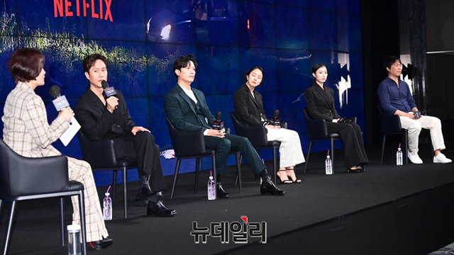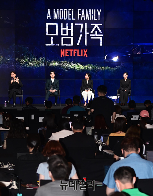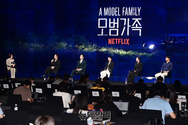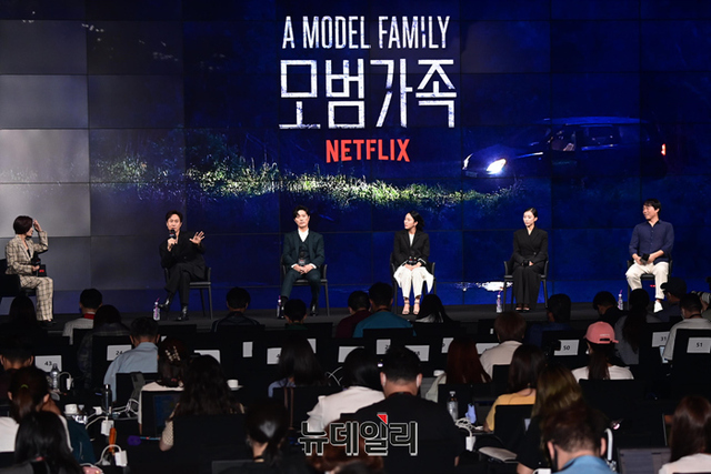 넷플릭스 시리즈 '모범가족' 제작발표회가 9일 오전 서울 종로구 JW 메리어트 동대문에서 열리고 있다.