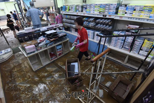 기록적인 폭우로 서울 전역에 침수 피해가 발생된 9일 오전 서울도심에서 시민들이 복구 작업을 하고 있다.