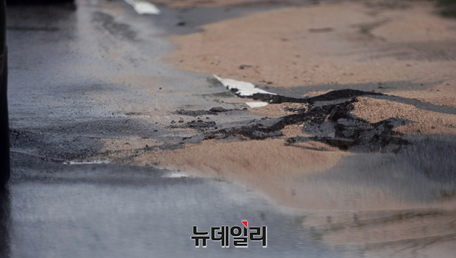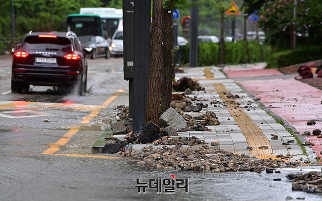 수도권 지역에 집중적으로 내린 폭우로 9일 오전 경기 성남시 동막로 일대에 침수피해를 입은 차량이 방치돼 있다. 도로 곳곳엔 어젯밤 폭우로 침수된 차량이 곳곳에 방치돼 있다. 도로는 파손되고 인도는 넘어 들어온 자갈과 모래 등이 쌓여 통행이 불편하다.