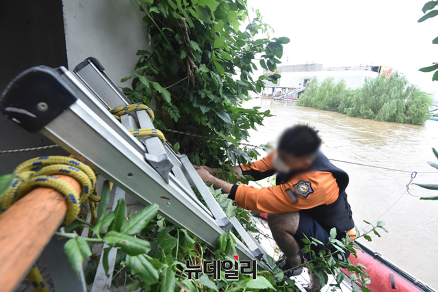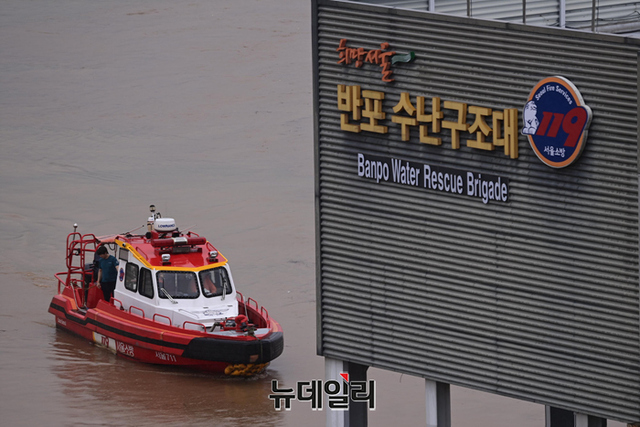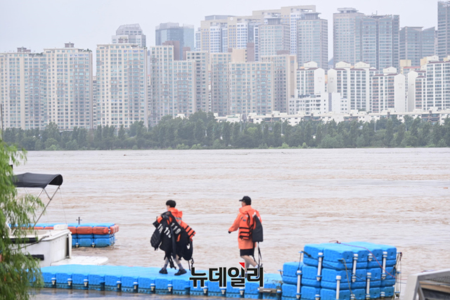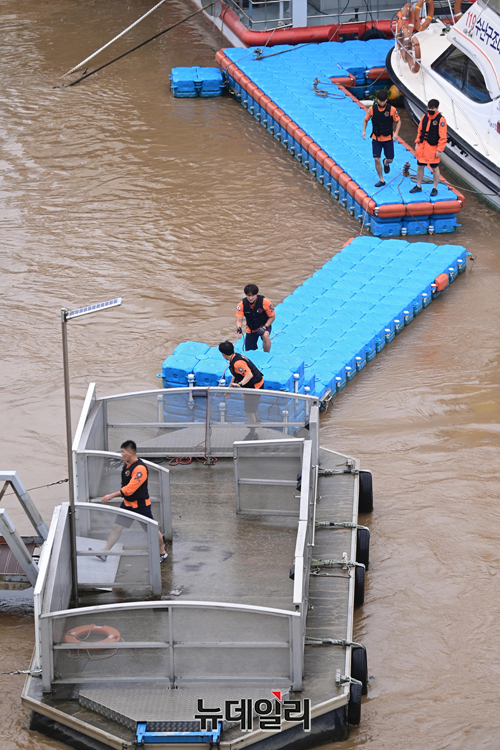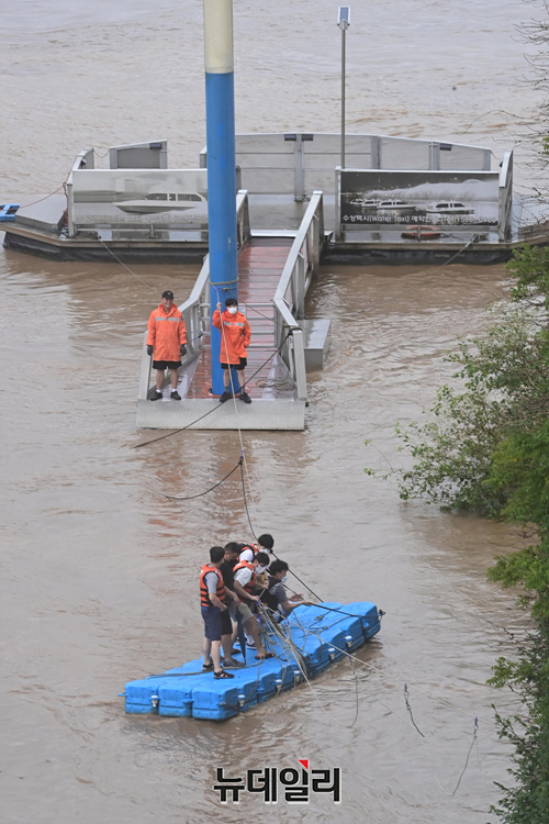 수도권에 내린 집중호우로 한강 통행로가 물에 잠긴 9일 오후 서울 동작구 반포수난구조대에서 소방대원들이 수상구조물(폰툰)에 탑승해 시설구조물을 점검하고 있다.