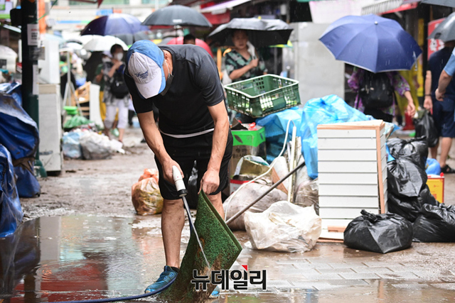 수도권에 내린 집중호우로 침수 피해를 입은 상인들이 9일 오후 서울 동작구 남성사계시장에서 복구 작업을 하고 있다.기상청은 "내일(10일)은 전국이 대체로 흐리고 수도권과 경북권울 중심으로 많은 비가 이어지겠다"며 "전국이 정체전선의 영향을 받겠다"고 말했다.