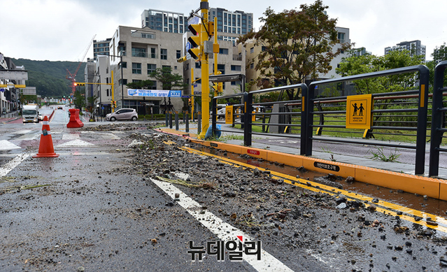 인근 도로엔 침수된 차량이 방치돼 있다. 도로는 흘러 내린 토사와 빗물로 차량 정체가 이어지고 있다.