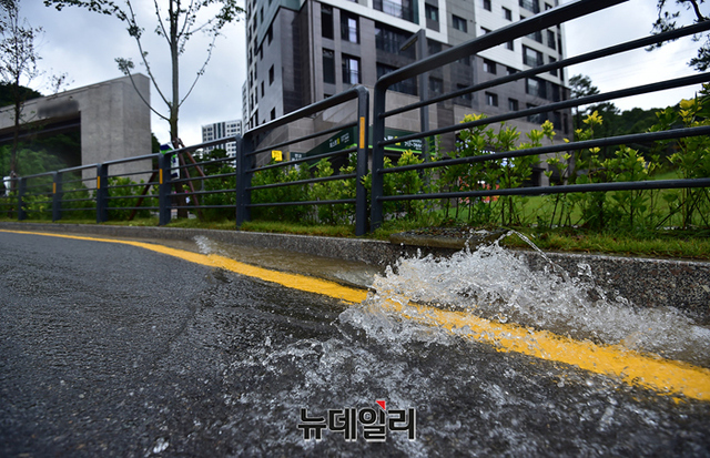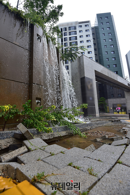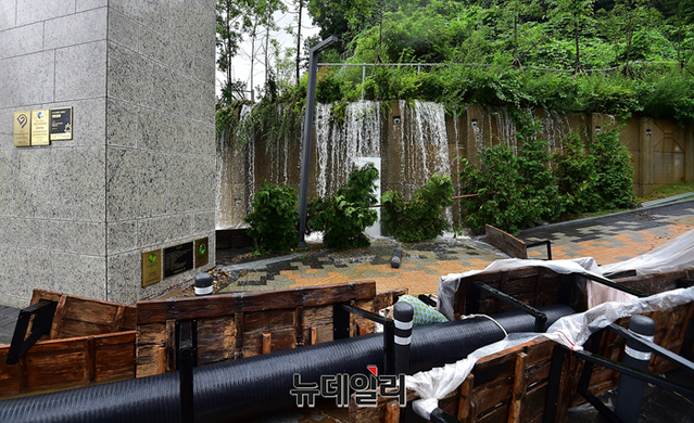 수도권 지역에 기록적인 폭우가 내리고 있는 9일 오전 경기 성남시 판교 대장동의 한 아파트 입구 옹벽에서 주변 산에서 내려오는 빗물이 모여 폭포처럼 흘러 내리고 있다.