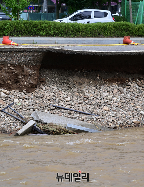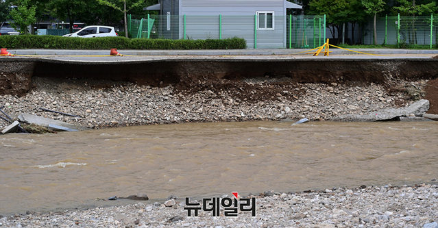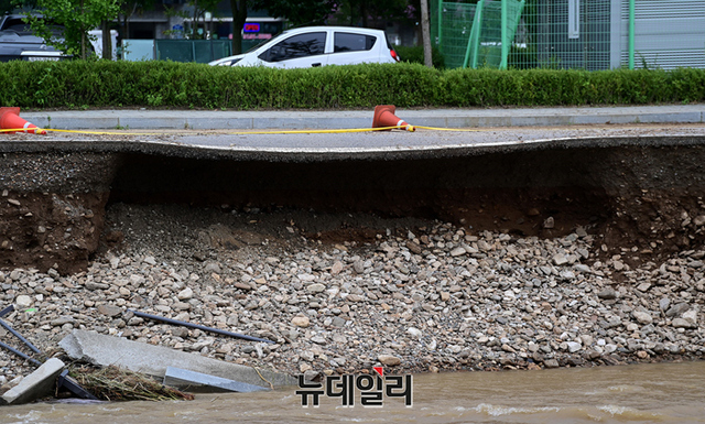 수도권 지역의 집중호우가 소강상태를 보이고 있는 10일 오후 경기 광주시의 한 도로에서 도로 하부가 유실돼 아스팔트만 남은 모습. 팔당댐으로 이어지는 도로엔 집중호우로 도로 곳곳이 파손됐다. 인근 산에서 토사가 넘어와 곳곳에서 복구작업 중이다.