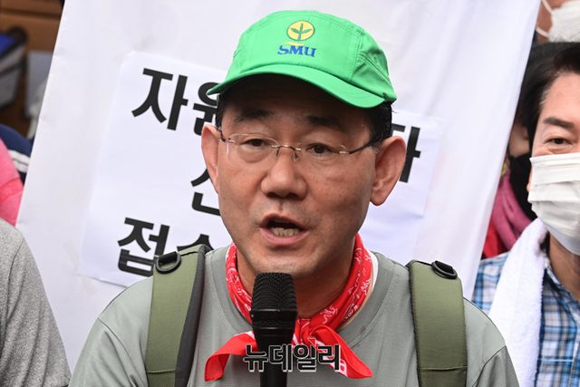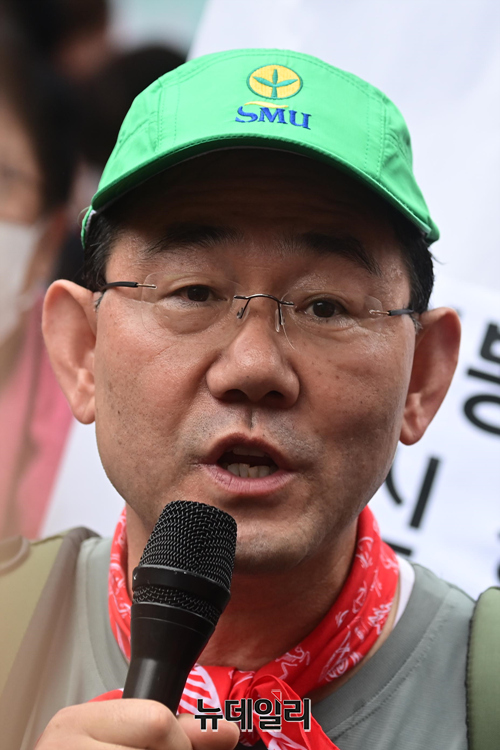 주호영 국민의힘 비상대책위원장이 11일 오전 서울 동작구 사당2동 주민센터 앞을 찾아 수해 피해지역 자원봉사에 앞서 발언 하고 있다.