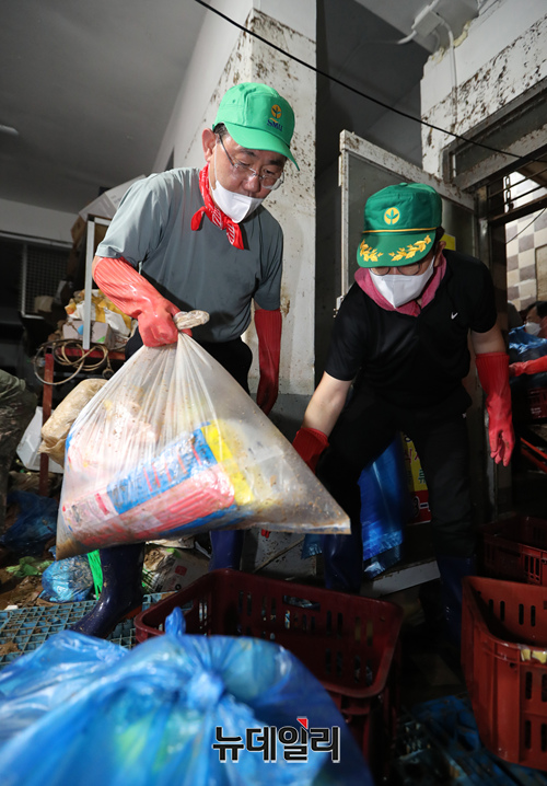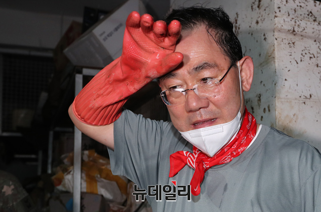 주호영 국민의힘 비상대책위원장이 11일 오전 서울 동작구 남성사계시장에서 수해 복구 봉사활동 중 이마의 땀을 닦고 있다. (공동취재사진)