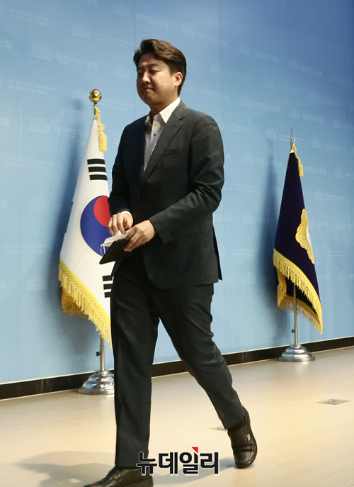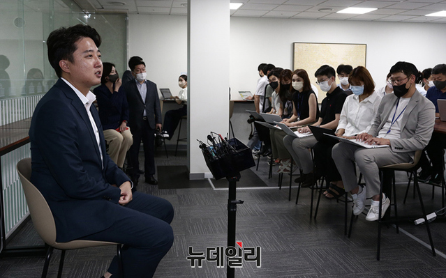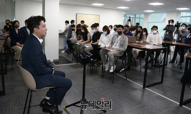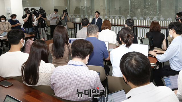 이준석 국민의힘 대표가 13일 오후 국회 소통관에서 기자회견을 열고 취재진의 질의에 답하고 있다.