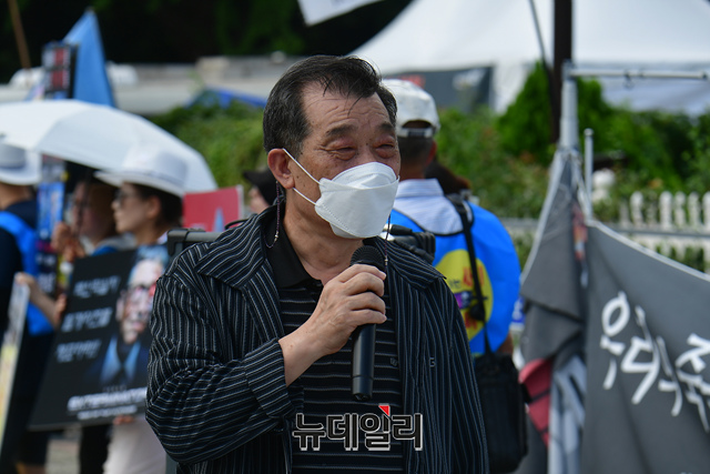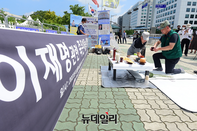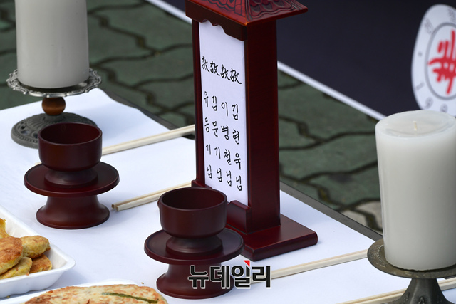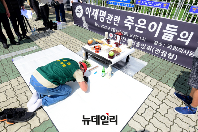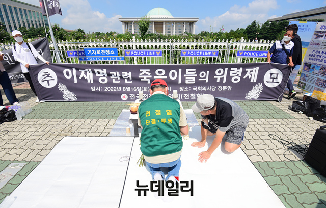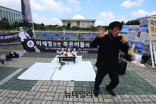 전국철거민협의회중앙회(전철협)가 16일 오전 국회 정문 앞에서 '이재명 관련 죽은이의 위령제'를 갖고 있다.전철협은 "검경이 신속한 수사를 하지 않는 사이 4명의 죽음이 발생했다" 며 "지난해 12월 대장동 개발사업 의혹 수사 중 극단적 선택을 한 대장동 개발사업 수사 중 유한기 전 성남도시개발공사 개발사업본부장, 김문기 전 성남도시개발공사 개발사업1처장, 변호사비 대납 의혹 제보자 이병철 씨, 지난달 김혜경 씨 법인카드 의혹 관련 경찰 수사 중 숨진 채 발견된 김현욱 씨 등 4명을 위로한다"고 밝혔다.