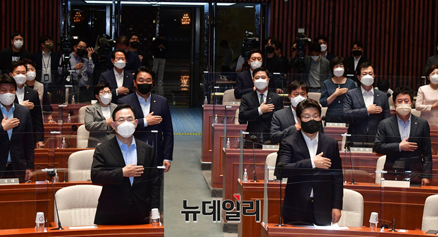주호영 국민의힘 비상대책위원장, 권성동 원내대표 및 소속 의원들이 16일 국회에서 열린 의원총회에서 국민의례를 하고 있다.