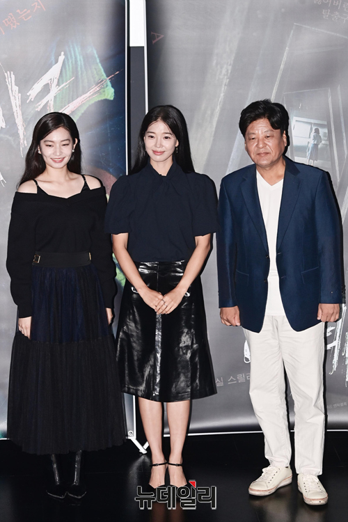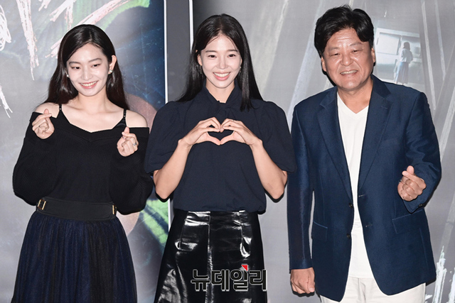 이윤호 감독(왼쪽부터), 배우 한지원, 임세미, 성지루가 17일 오후 서울 광진구 롯데시네마 건대입구점에서 열린 영화 '어웨이크' 언론배급시사회에서 포즈를 취하고 있다.