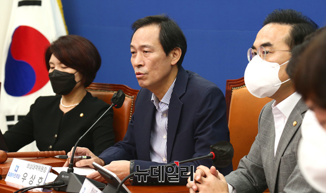 우상호 더불어민주당 비상대책위원장이 17일 오전 국회에서 열린 비상대책위원회의에서 발언을 하고 있다.