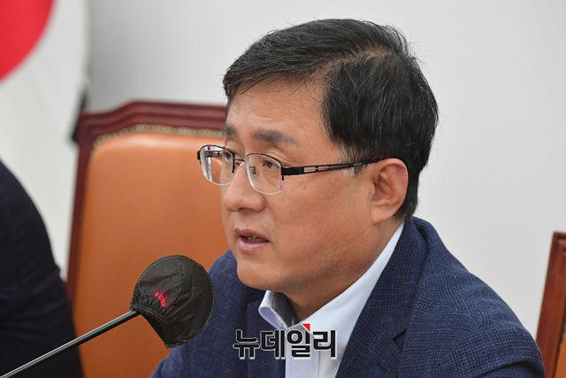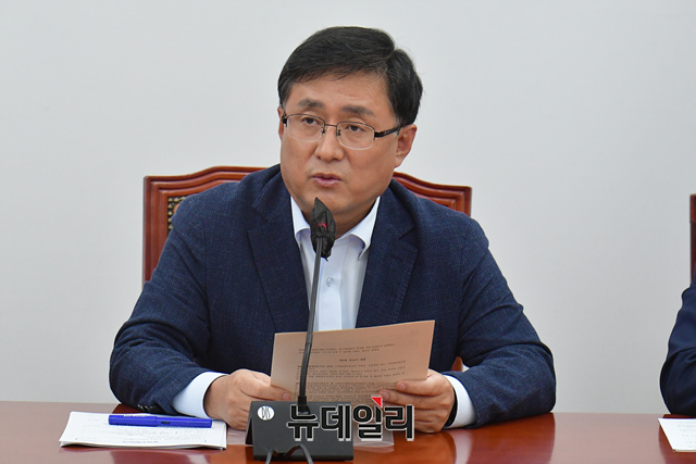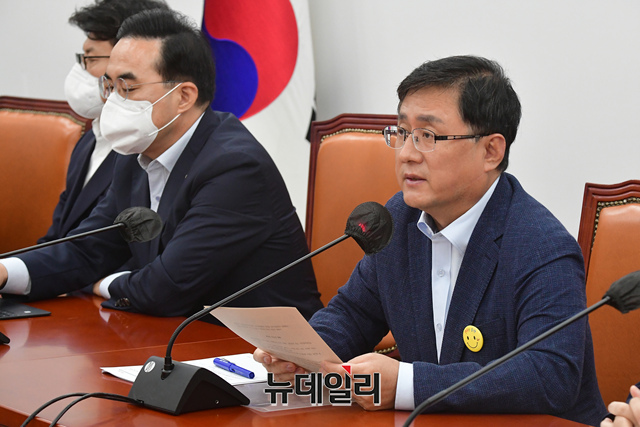 김성환 더불어민주당 정책위의장이 18일 오전 국회에서 열린 정책조정회의에서 모두발언을 하고 있다.