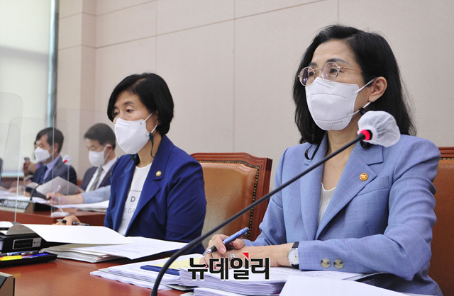 김현숙 여성가족부 장관이 18일 오전 국회에서 열린 여성가족위원회 전체회의에서 2021회계연도 결산보고를 하고 있다. (공동취재사진)