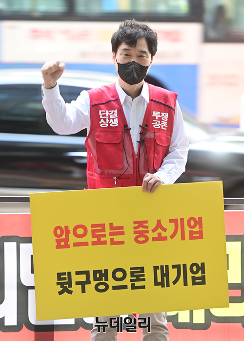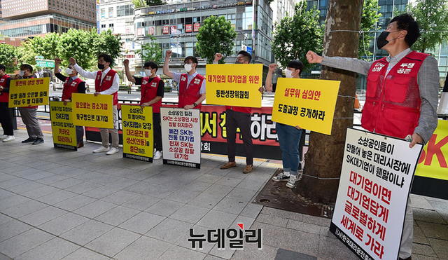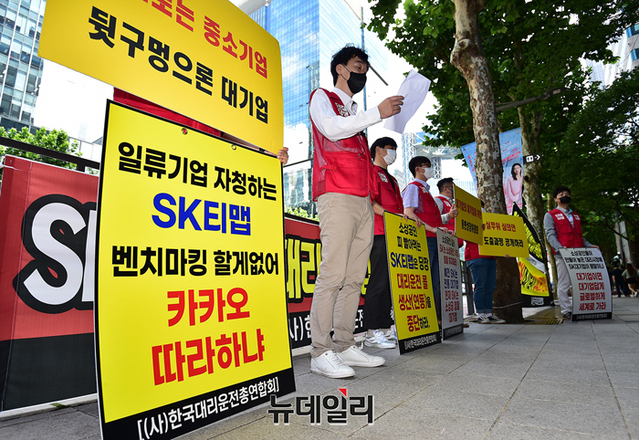 한국대리운전총연합회가 23일 오후 서울 종로구 티맵모빌리티 앞에서 SK티맵의 대리운전 시장확장 중단을 촉구하며 구호를 외치고 있다. 이들은 7일간 게릴라 시위를 이어가며 9월 1일 전국총궐기대회를 예고 했다.