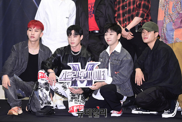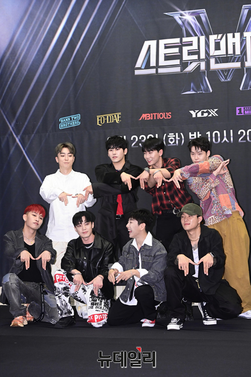 크루 엠비셔스가 23일 오후 서울 마포구 스탠포드호텔코리아에서 열린 엠넷 새 예능 '스트릿 맨 파이터(연출 최정남)' 제작발표회에서 포즈를 취하고 있다.