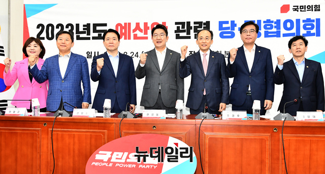 권성동 국민의힘 원내대표, 추경호 경제부총리 겸 기획재정부 장관 및 참석자들이 24일 국회에서 열린 '2023년도 예산안 관련 당정협의회'에서 기념촬영을 하고 있다. (왼쪽부터 양금희 국민의힘 원내대변인, 송언석 원내수석부대표, 이철규 국회 예산결산특별위원회 간사, 성일종 정책위의장 , 권성동 원내대표, 추경호 경제부총리 겸 기획재정부 장관, 최상대 기획재정부 2차관, 김완섭 기획재정부 예산실장, 임기근 기획재정부 예산총괄심의관)