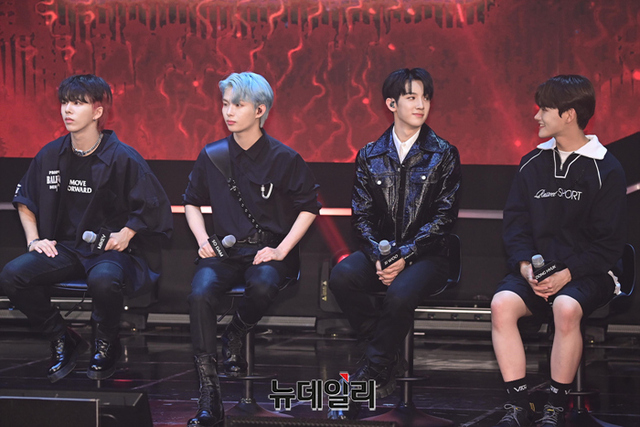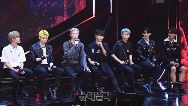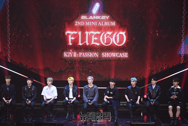 아이돌그룹 블랭키(디케이, 루이, 동혁, 시우, 마이키, 유, 영빈, 성준, 소담)가 4일 오전 서울 광진구 건국대학교 새천년관 대공연장에서 열린 디지털 미니앨범 '키 투:패션 푸에고' 발매기념 쇼케이스에서 취재진의 질문을 듣고 있다.