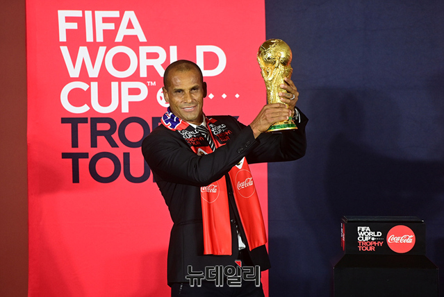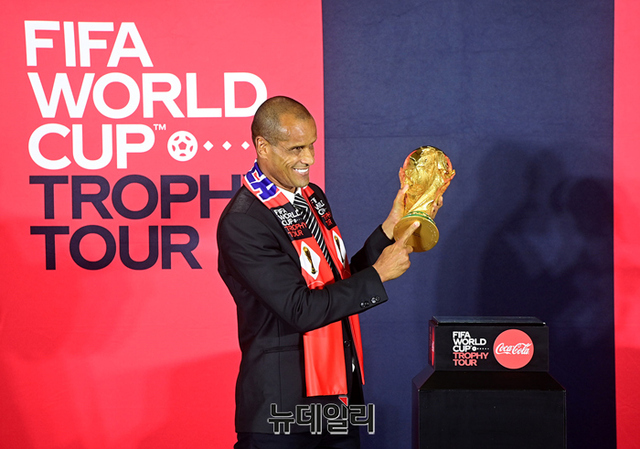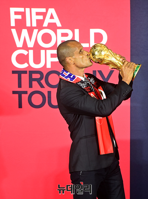 2002년 피파 월드컵 우승 주역 브라질 히바우두 선수가 24일 오후 서울 여의도 더 현대 서울에서 열린 피파월드컵 공개 행사에서 트로피에 입 맞추고 있다.